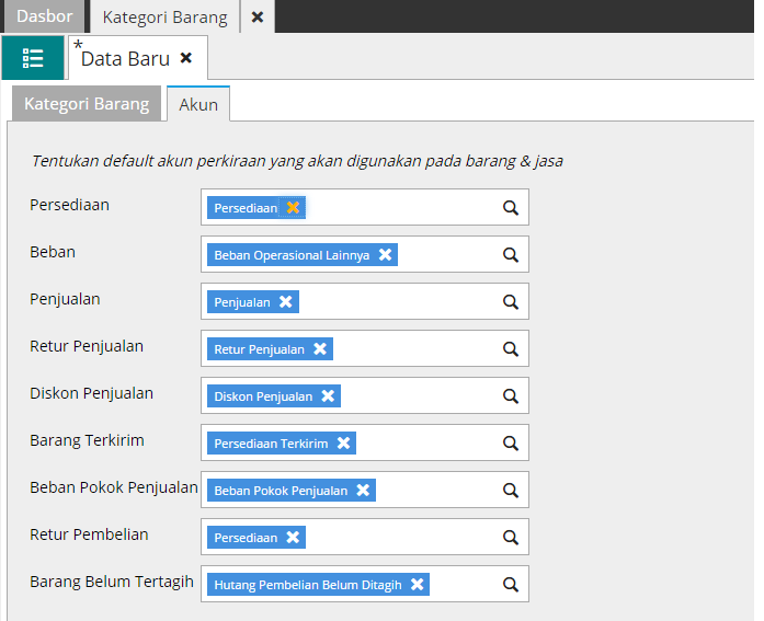 - Pada tab Akun, secara otomatis akan mengikuti setting pada menu Pengaturan | Preferensi | Akun Perkiraan | Barang.