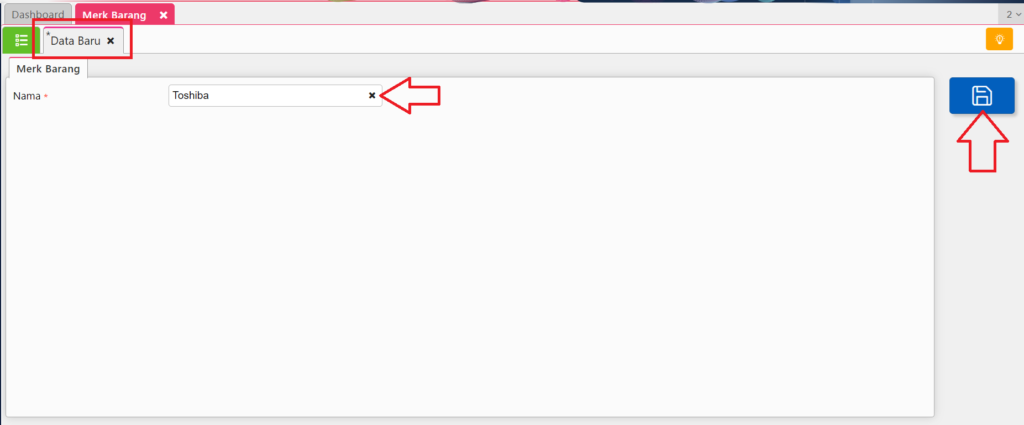 1. Lalu isikan Merk Barang sesuai kebutuhan pada formulir Data Baru kemudian Simpan.