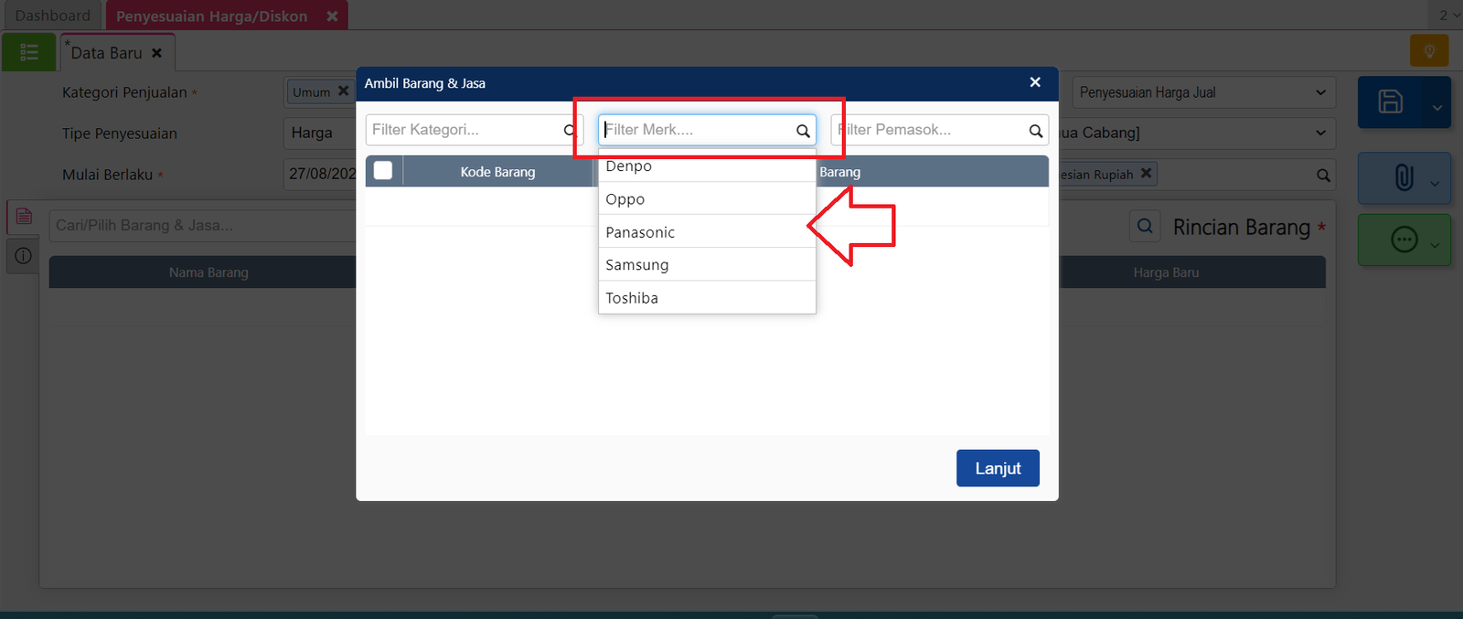 Merk Barang pada Filter di Penyesuaian Harga/Diskon Barang