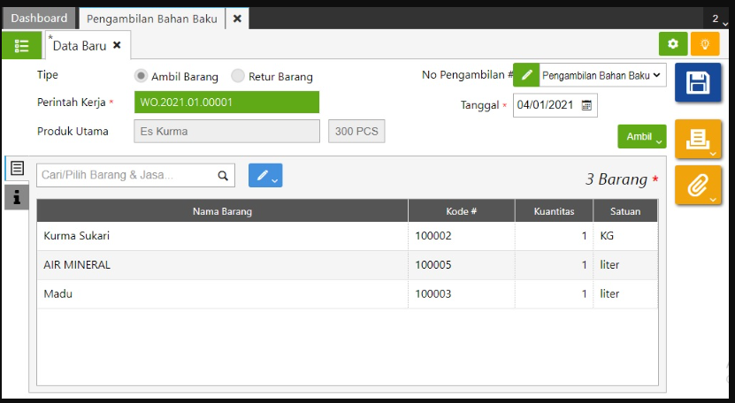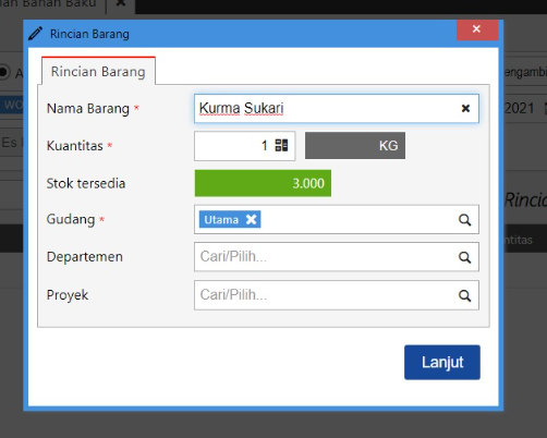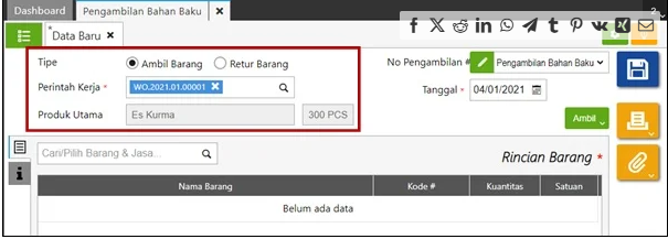 Catatan : dalam pengambilan bahan baku, anda bisa melakukan pengambilan secara bertahap atau sekaligus. Dan jika penggunaan bahan baku melebihi dari Rencana Produksinya, maka anda bisa menambahkan bahan baku sesuai kebutuhan.