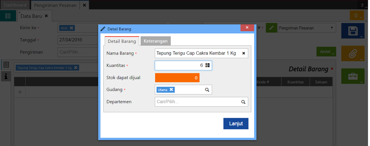 - Lengkapi informasi Kirim Ke, Tanggal dan Barang yang akan dikirimkan.