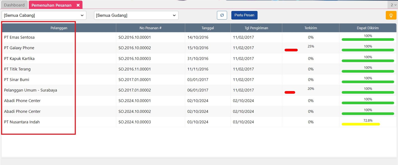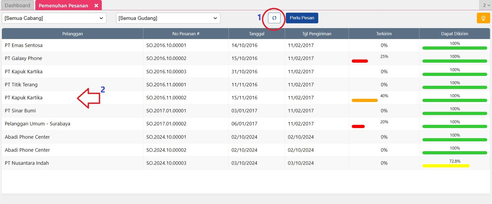 - Setelah dibuatkan Pengiriman Pesanan, untuk Pesanan Penjualan yang sudah 100% dikirim akan hilang dari data di Pemenuhan Pesanan.