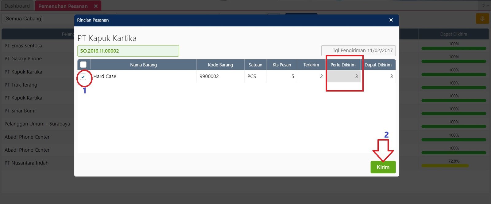 - Klik tombol Perbarui untuk menampilkan Data Pemenuhan Pesanan kemudian Pilih transaksi Pesanan Penjualan yang akan dilakukan Pengiriman Pesanan dan akan tampil detail informasi barang pada transaksi Pesanan Penjualan tersebut, pilih barang yang akan dibuatkan Pengiriman Pesanannya lalu klik ‘Kirim’.