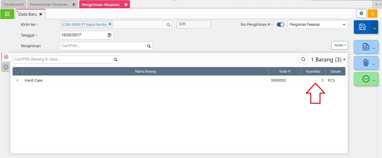- Maka akan tampil formulir Pengiriman Pesanan dengan jumlah barang yang dipilih, jika Anda ingin mengubah jumlah kuantitas barang yang dikirim bisa diubah pada formulir Pengiriman Pesanan tersebut, kemudian simpan transaksi pengiriman pesanan tersebut.