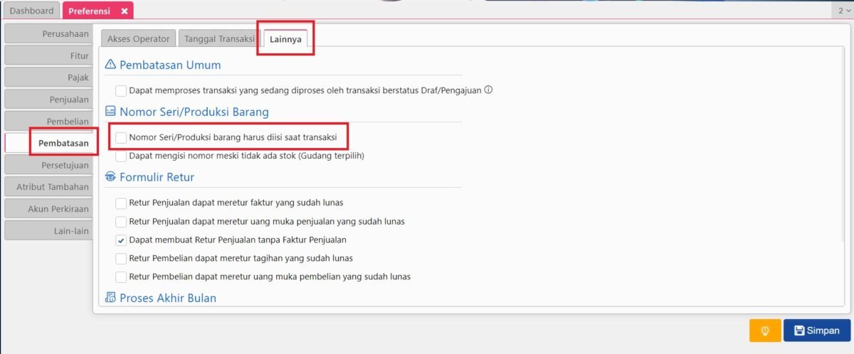 - Untuk bisa menggunakan Formulir Pengisian Nomor Seri, lakukan pengaturan terlebih dahulu melalui menu Pengaturan | Preferensi | Pembatasan pada tab Lainnya, jangan centang pada informasi ‘Nomor Seri/Produksi Barang harus diisi saat transaksi’.