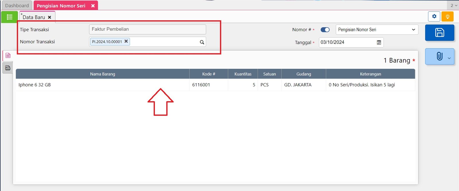- Pilih Tipe Transaksi dan Nomor Transaksi atas barang yang akan diisikan nomor seri/produksinya sehingga tampil semua barang yang akan diisikan nomor seri/produksi pada formulir pengisian nomor seri.