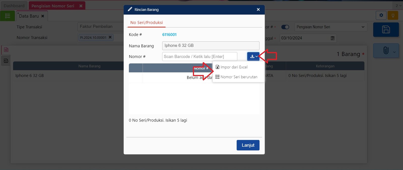 - Klik pada barang yang akan diisikan nomor seri/produksinya lalu isikan nomor seri/produksi dengan mengetikan satu per satu pada kolom Nomor # atau bisa dengan cara Impor Data melalui excel seperti disini.