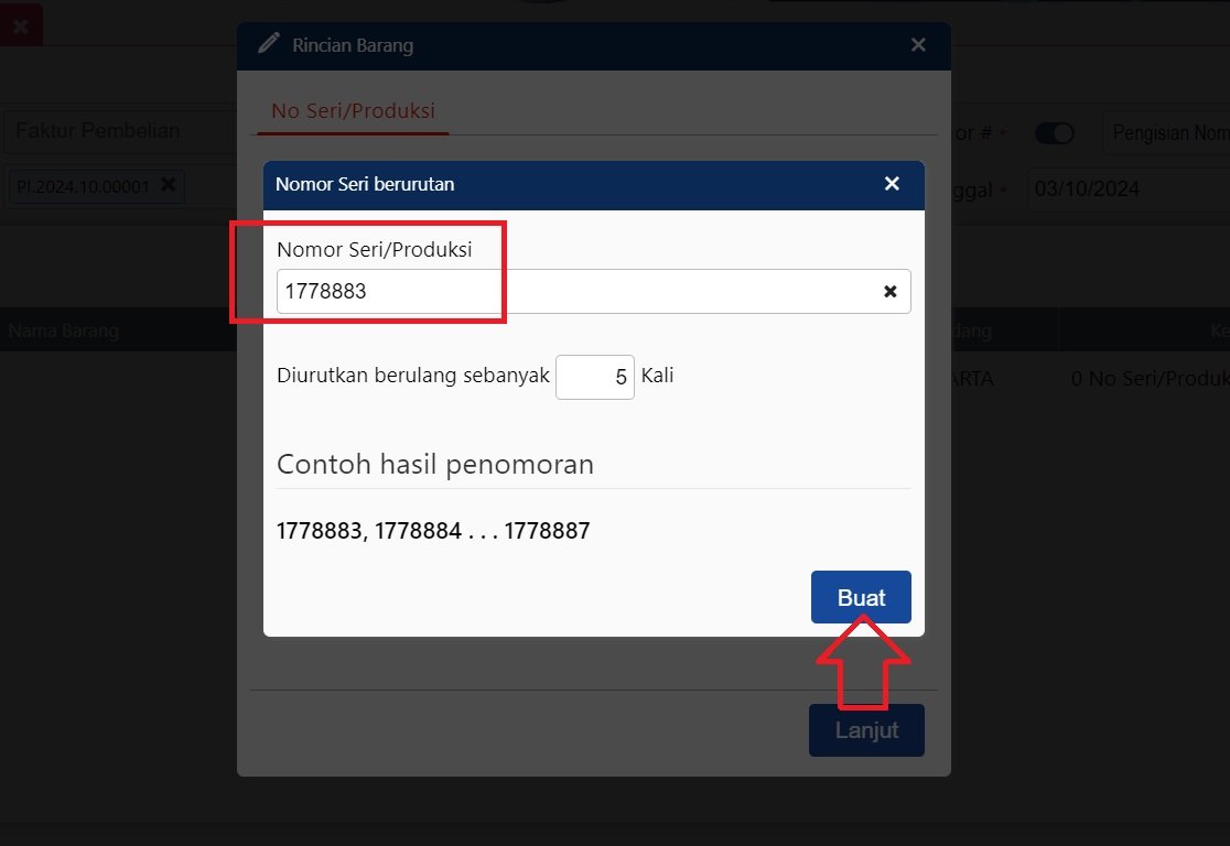- Untuk pengisian nomor seri/produksi secara berurutan pada Impor Data klik pilihan ‘Nomor Seri Berurutan’ dan akan tampil box untuk pengisian Nomor Seri/Produksi, lalu isikan jumlahnya pada kolom ‘Diurutkan berulang sebanyak’ kemudian klik buat.