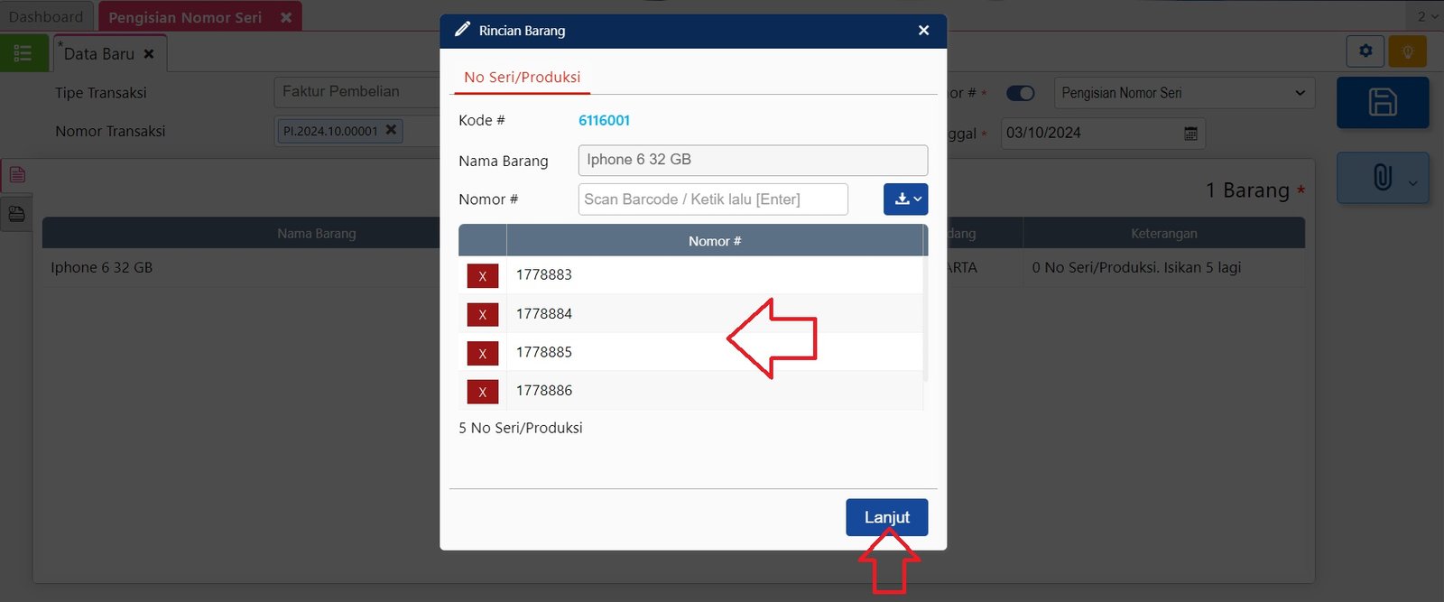 - Klik ‘Lanjut’ untuk melanjutkan penyimpanan Nomor Seri/Produksi yang telah diisikan dan lanjutkan proses pengisian nomor seri/produksi barang lainnya.