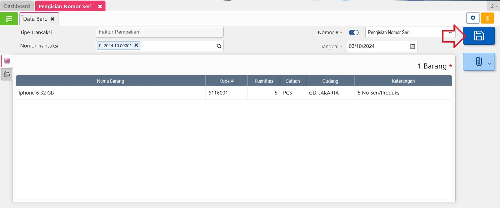 Menyimpan Transaksi Pengisian Nomor Seri/Produksi
