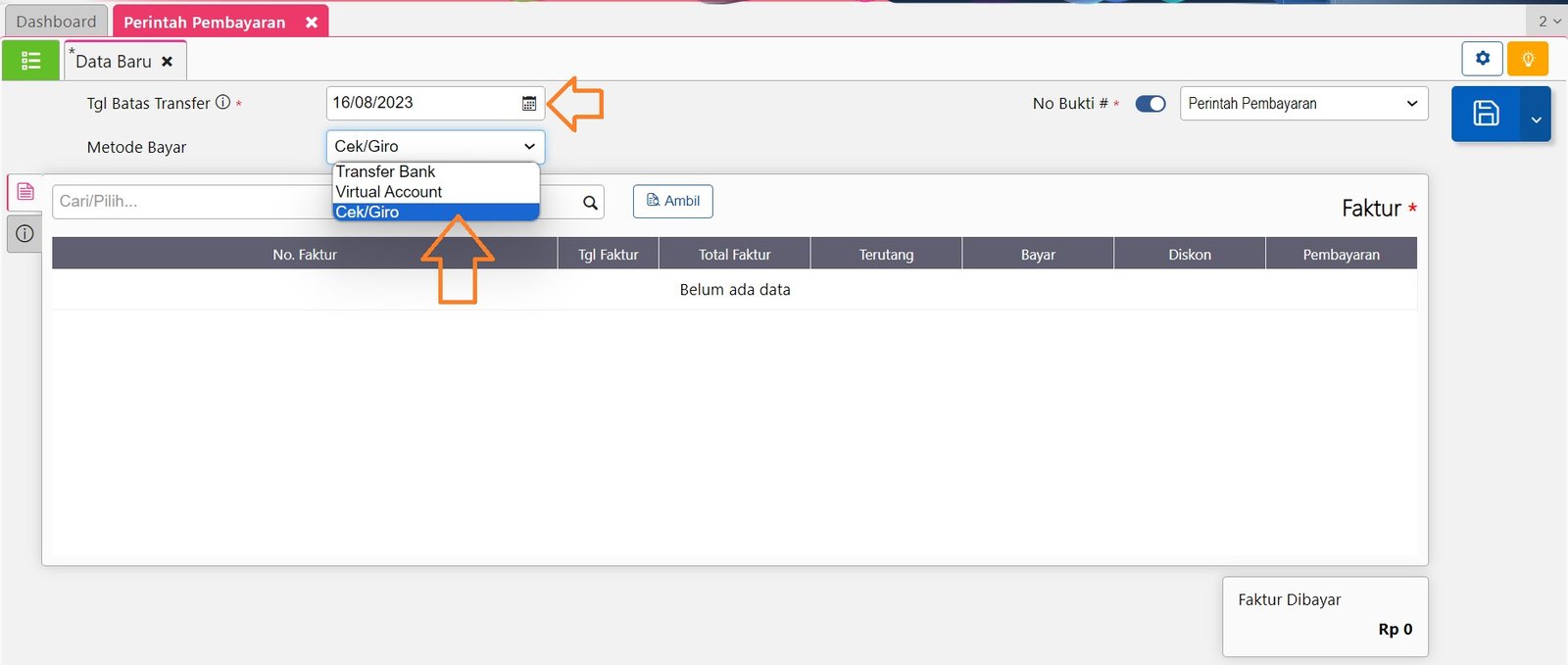1. Pada tab Data Baru lengkapi informasi ‘Tgl Batas Transfer’ dan pilih ‘Metode Bayar’ yang sesuai pada Perintah Pembelian tersebut. Tgl Batas Transfer diisikan dengan tanggal batas akhir pembayaran harus dilakukan, sedangkan Metode Bayar, dipilih dengan metode bayar yang dilakukan perusahaan Anda ke pemasok, tersedia 3 jenis Metode Bayar yaitu (a) Transfer Bank, (b) Virtual Account dan (c) Cek/Giro.