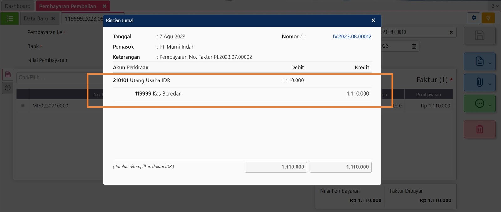 1. Jurnal transaksi Pembayaran Pembelian atas transaksi Perintah Pembayaran akan dilawankan ke akun Kas Perintah Pembayarannya.