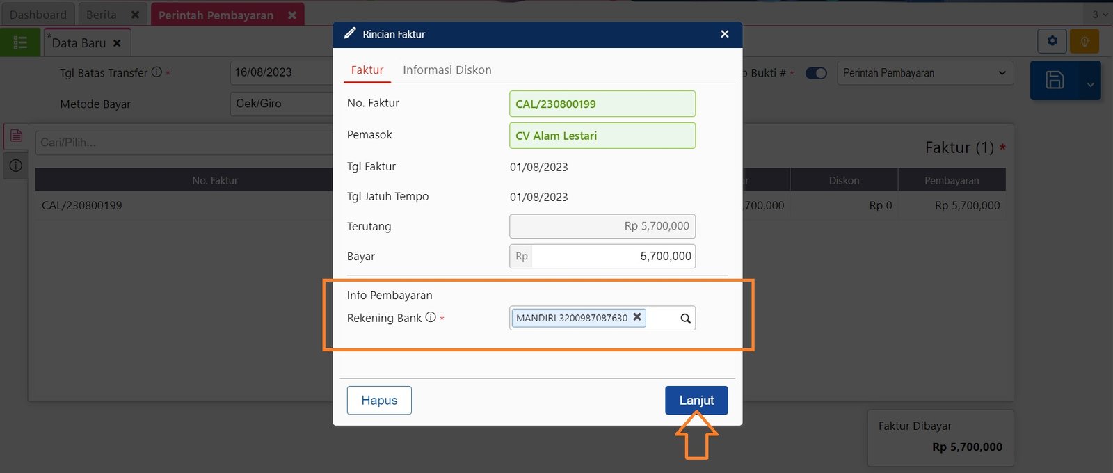 1. Setelah memilih Faktur Pembelian yang diperintahkan untuk dibayar klik ‘Lanjut’ kemudian klik pada baris Faktur Pembelian untuk mengisikan ‘Nomor Rekening Bank’ tujuan untuk pembayaran faktur pembelian tersebut.