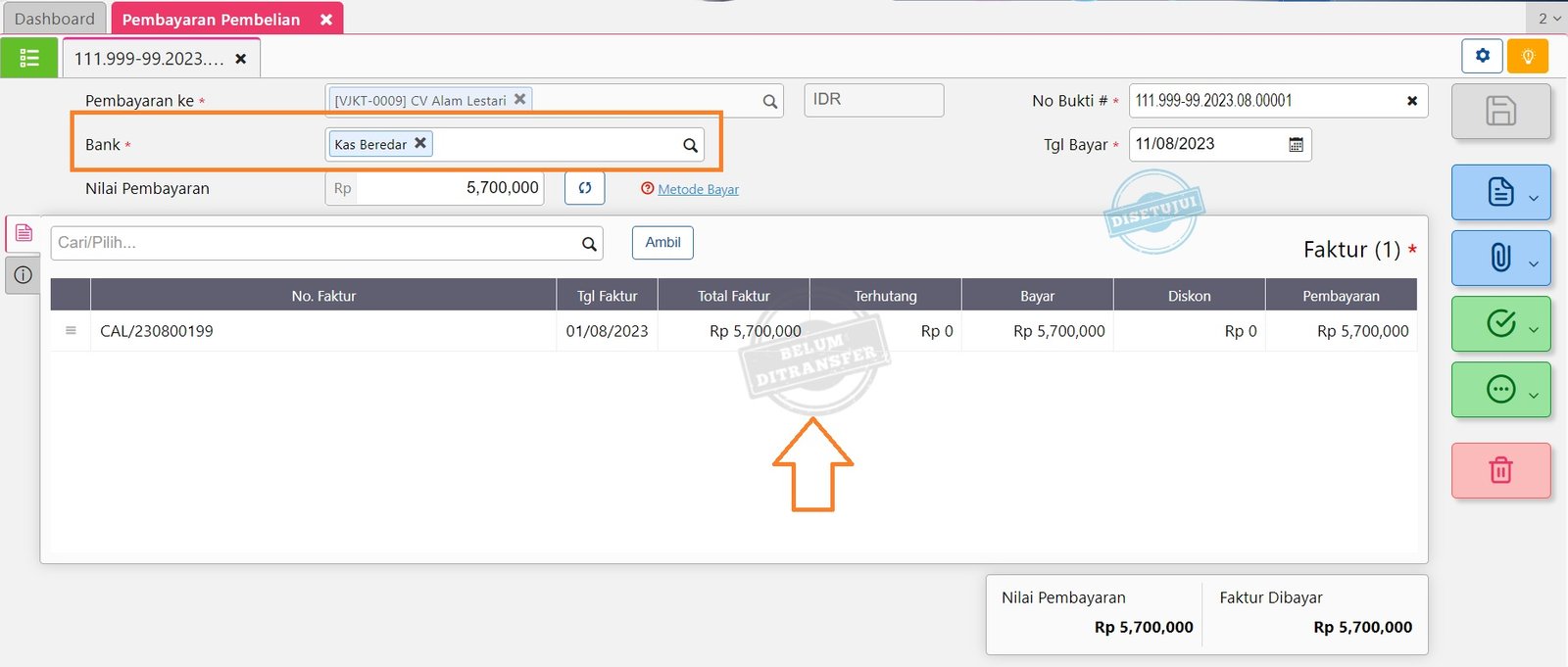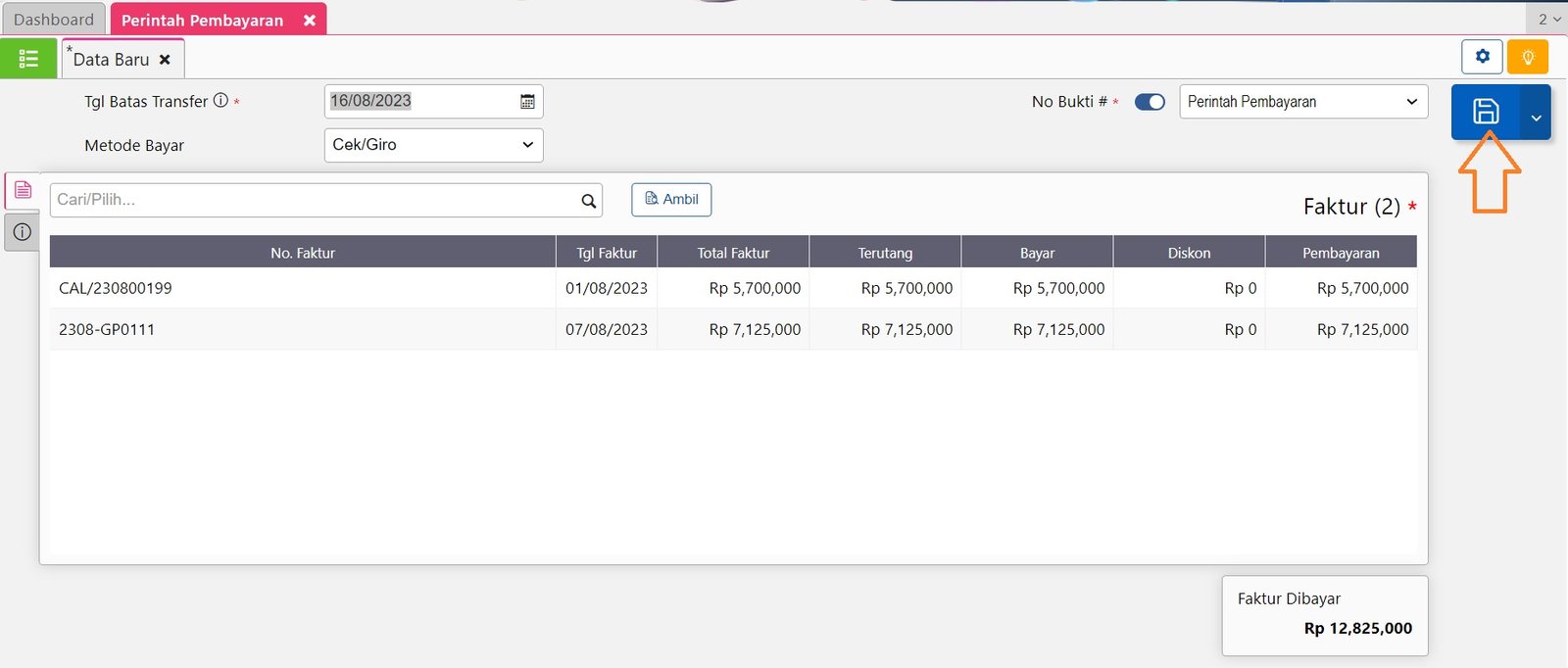 1. Lakukan langkah diatas untuk semua Faktur Pembelian yang terdapat pada Transaksi Perintah Pembayaran tersebut, kemudian simpan transaksi Perintah Pembayaran.