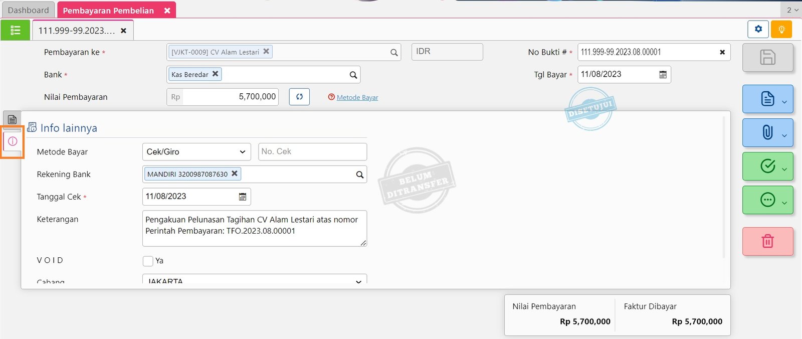 Tab Info Lainnya pada Transaksi Pembayaran Pembelian yang terbuat dari transaksi Perintah Pembayaran