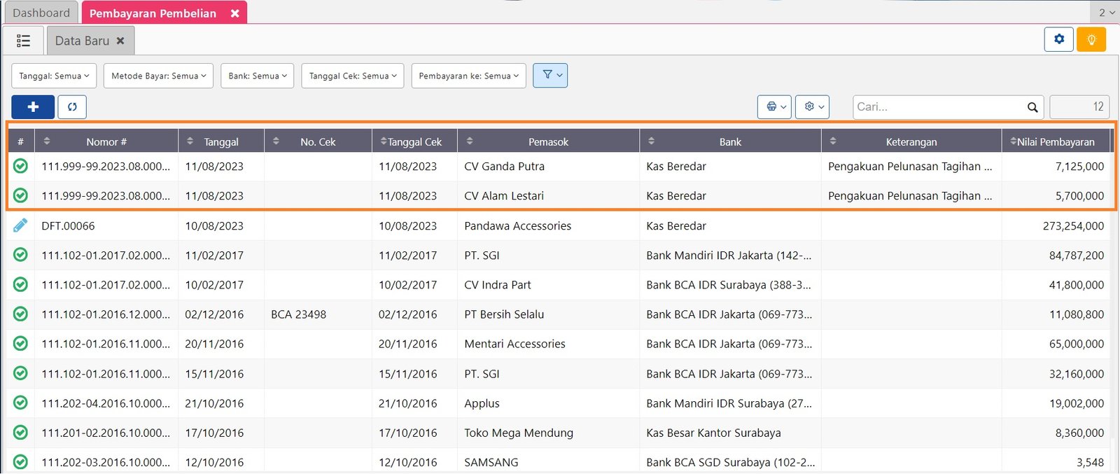 Transaksi Pembayaran Pembelian yang dibuat setelah transaksi Perintah Pembayaran tersimpan