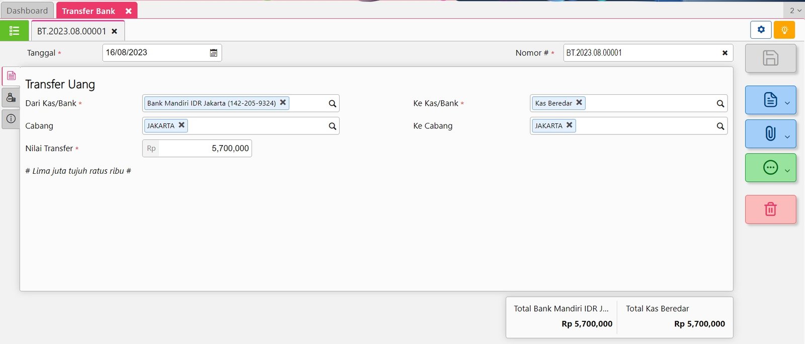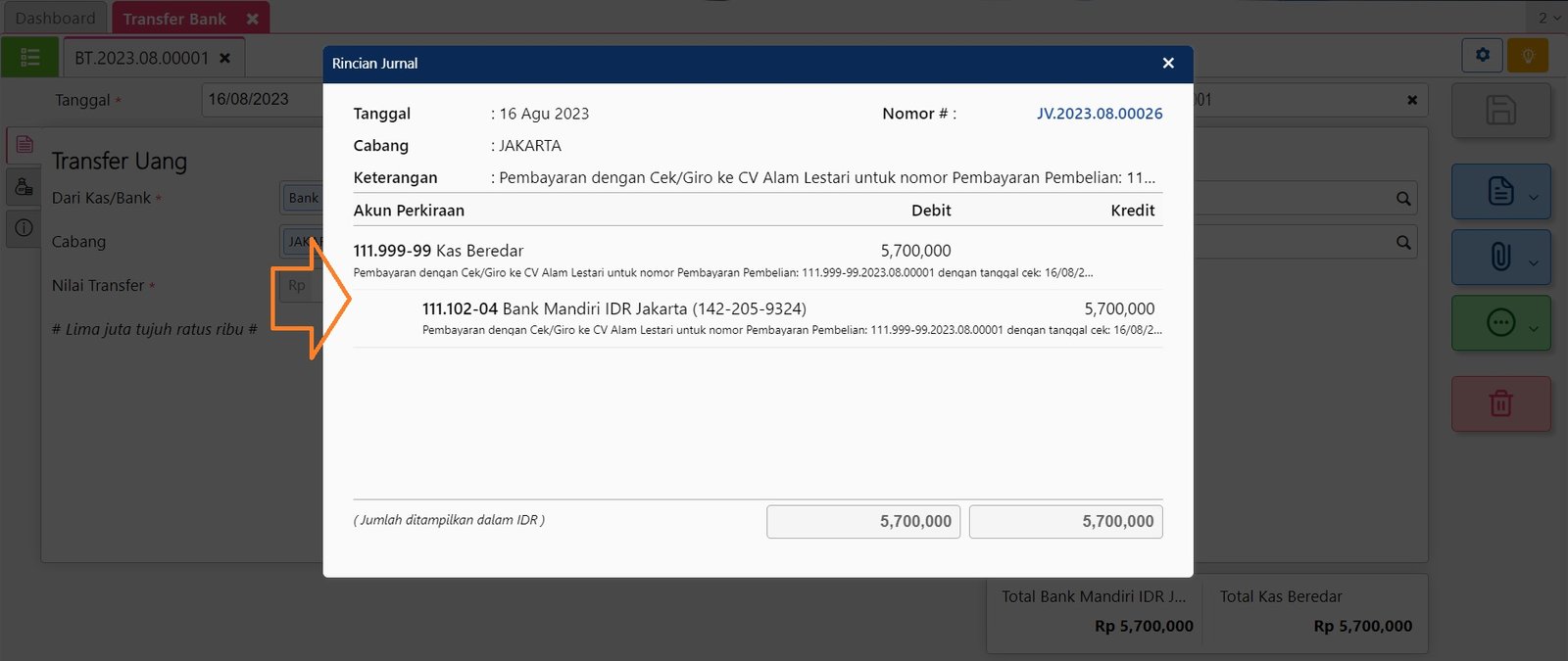 1. Dan atas pencatatan Transfer Pemasok tersebut, Accurate Online akan membuatkan transaksi Transfer Bank untuk menjurnal balik Akun Kas Perintah Pembayaran ke akun Kas/Bank yang sebenarnya.