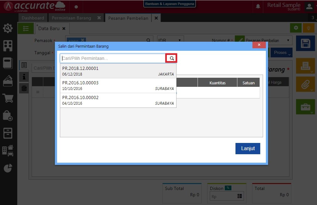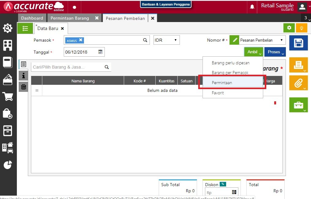 - Transaksi ini, bisa di lanjutkan dari menu Pembelian | Pesanan Pembelian | klik Ambil | pilih Permintaan.