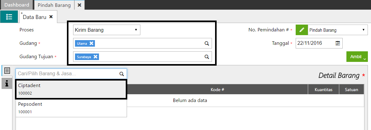 - Lengkapi informasi Proses, Tanggal, Gudang Pengirim, Gudang Tujuan, lalu pada bagian Cari/Pilih Barang & Jasa, masukan barang yang akan dipindahkan. Pada bagian Proses, tentukan apakah jenis pindah barang ini adalah Kirim Barang atau Terima Barang.