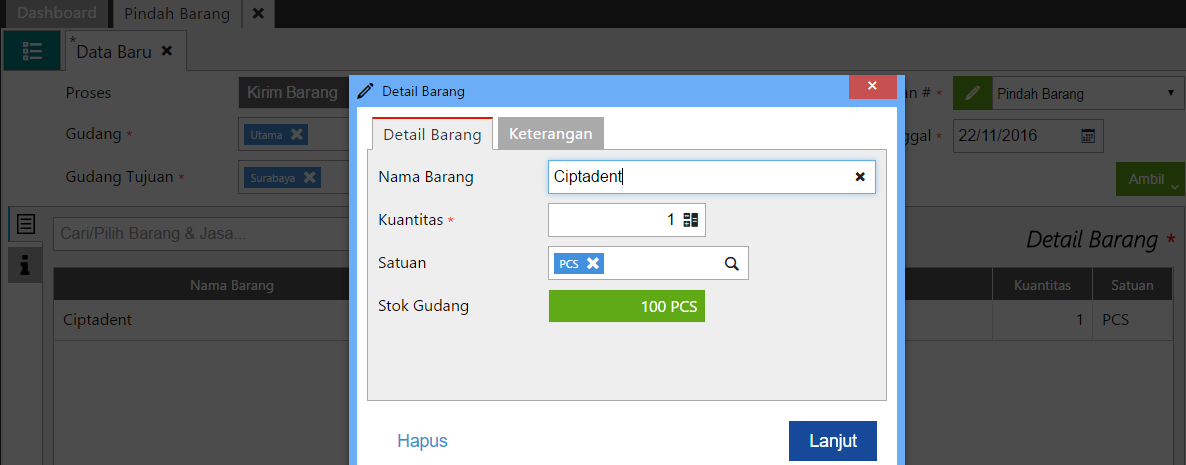 - Setelah memilih barang, tentukan kuantitas barang yang akan dipindahkan seperti pada gambar di bawah ini, lalu klik Lanjut.
