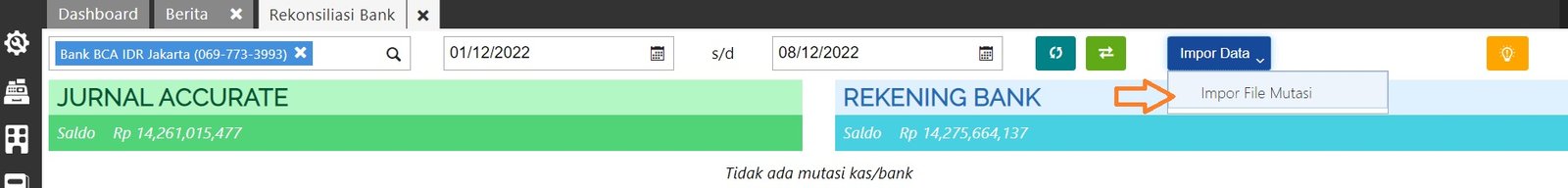 - Jika Anda menggunakan fasilitas Internet Banking, maka klik tombol ‘Impor Data’ kemudian pilih “Impor File Mutasi” (BCA Individual & BCA Bisnis)