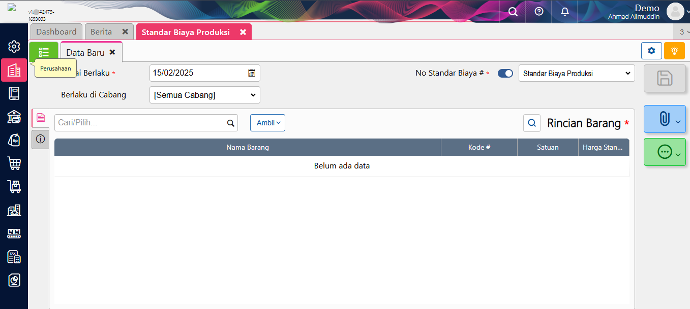 - Masuk ke menu Pabrikasi | Standar Biaya Produksi
