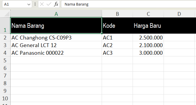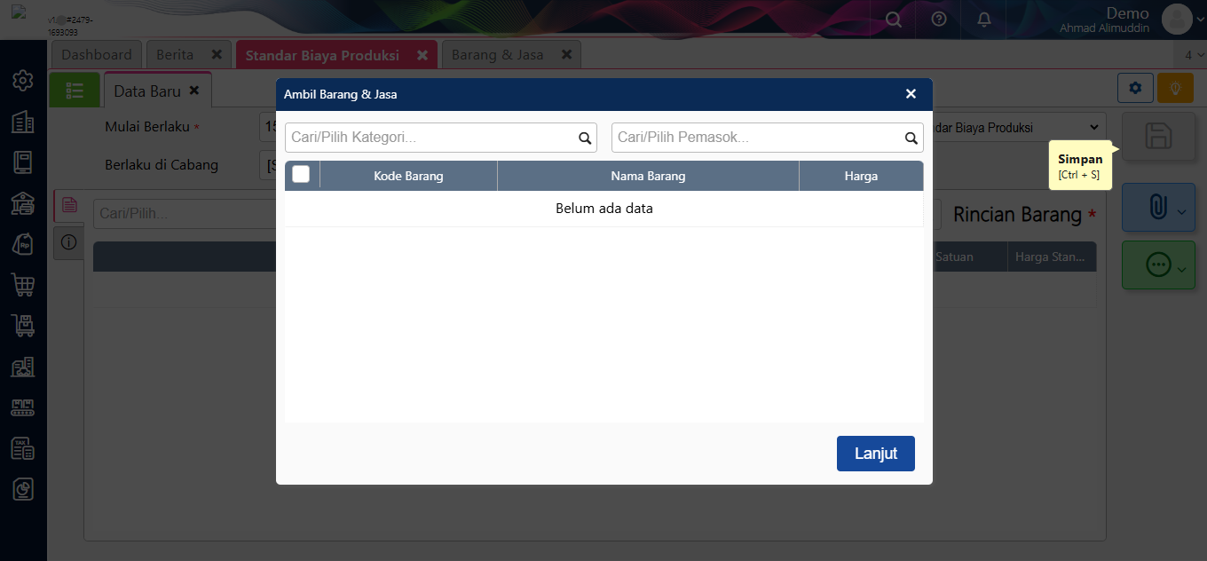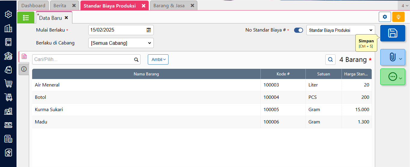 - Lakukan pada semua baris barang/biaya produksi hingga selesai kemudian simpan.