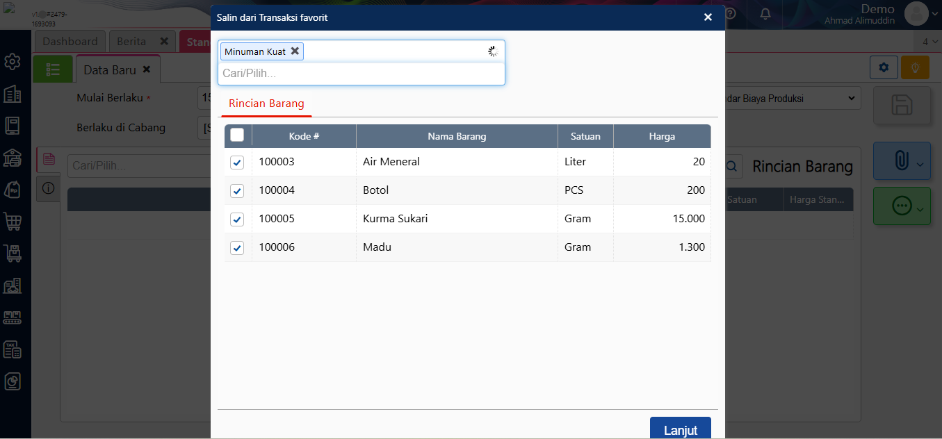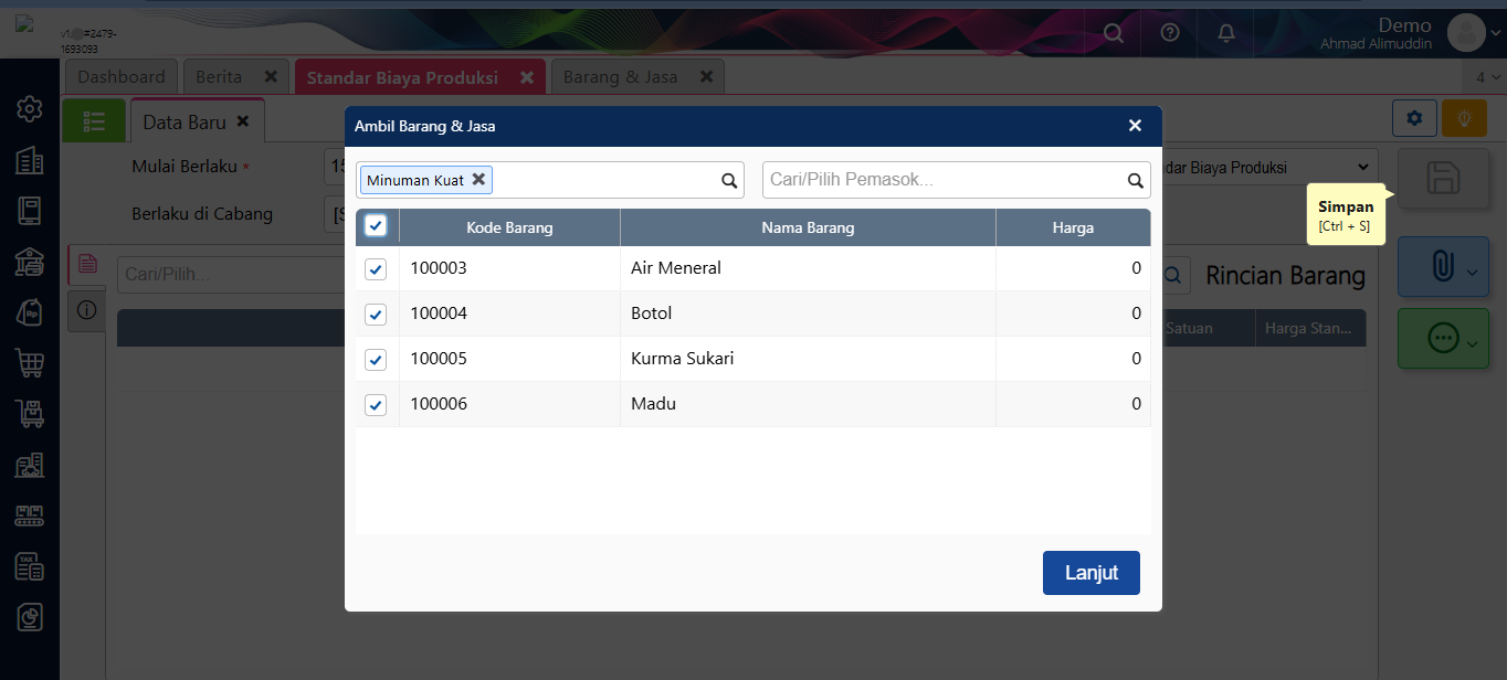 - Jika dipilih berdasarkan Kategori Barang, maka akan tampil semua barang untuk kategori tersebut. Silakan jangan centang barang-barang yang tidak ingin diisikan nilai standar biaya produksinya, kemudian klik ‘Lanjut’.