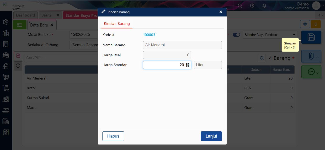 - Untuk mengisikan nilai standar biaya produksinya, klik satu per satu pada nama barang-nya hingga tampil box Rincian Barang untuk mengisikan nilai Harga Baru.Lakukan pada semua baris barang/biaya produksi hingga selesai kemudian simpan.