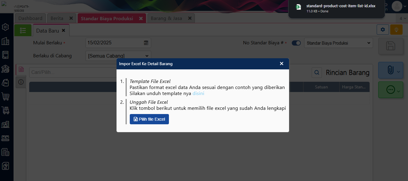 - Dan agar lebih mudah, anda bisa membuat Nilai Standar Biaya Produksi dengan mengimport dari file excel. Sehingga anda tidak perlu melakukan penginputan satu per satu. Sebelumnya, silakan buat file excel dari Daftar Barang dan Biaya Produksi yang akan dibuatkan nilai standar-nya, sesuai dengan format-nya.Format file excel, bisa anda unduh pada formulir Standar Biaya Produksi, klik ‘Ambil’ dan pilih pilihan ‘Impor dari Excel’ kemudian klik ‘disini’.