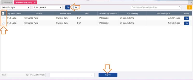 1. Ke menu Transfer Pemasok melalui menu Pembelian, pilih parameter yang sesuai kemudian klik ‘Perbarui’ agar tampil transaksi Pembelian yang akan dilakukan pembayaran ke pemasok, lalu berikan tanda centang pada transaksi pembelian yang akan dilakukan transfer lalu klik ‘ekspor’.