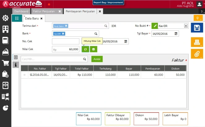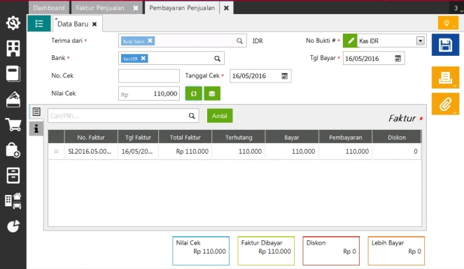 - Setelah itu klik icon Recalc ( Hitung Nilai Cek ) agar angkanya mengupdate, lalu klik icon icon Save ( Simpan ) agar transaksinya bisa terproses,