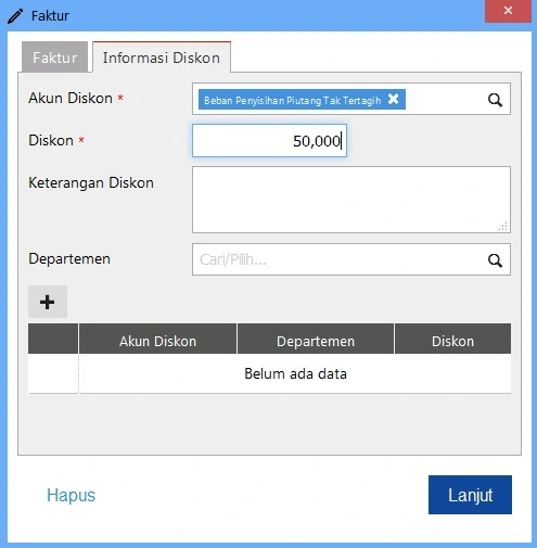 - Setelah memilih Invoice yang ingin dihapuskan Piutangnya, maka akan tampil tampilan informasi Invoice nya. Pilih tab Informasi Diskon, jika pada Preferensi nya sudah dibuatkan Akun Diskon nya maka akan otomatis terisi di tampilan ini, contohnya menggunakan akun Beban Penyisihan Piutang Tak Tertagih / Bad Debt Expense, inputkan nilai Diskon nya agar Piutang yang ingin dihapuskan akan teralokasi ke akun tsb, klik Lanjut.