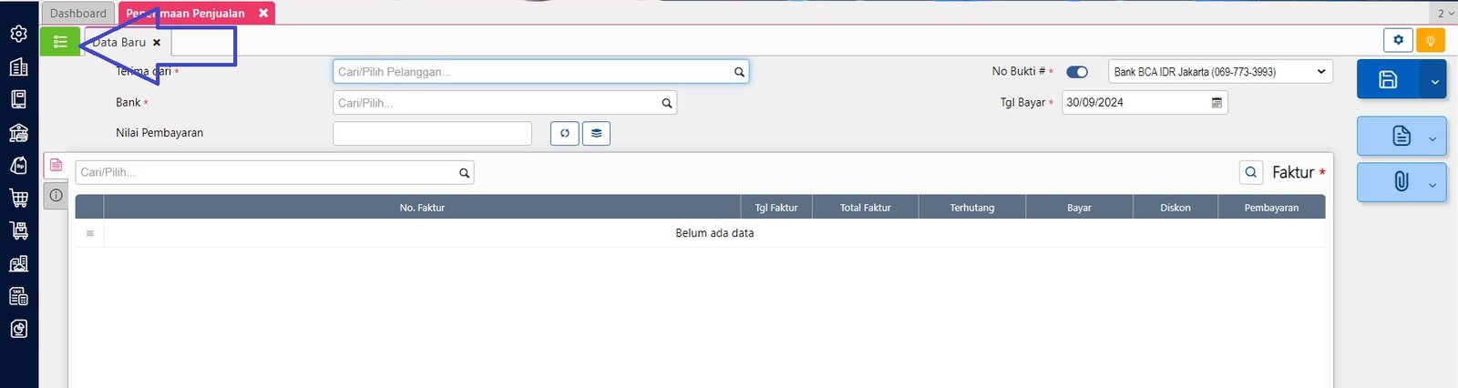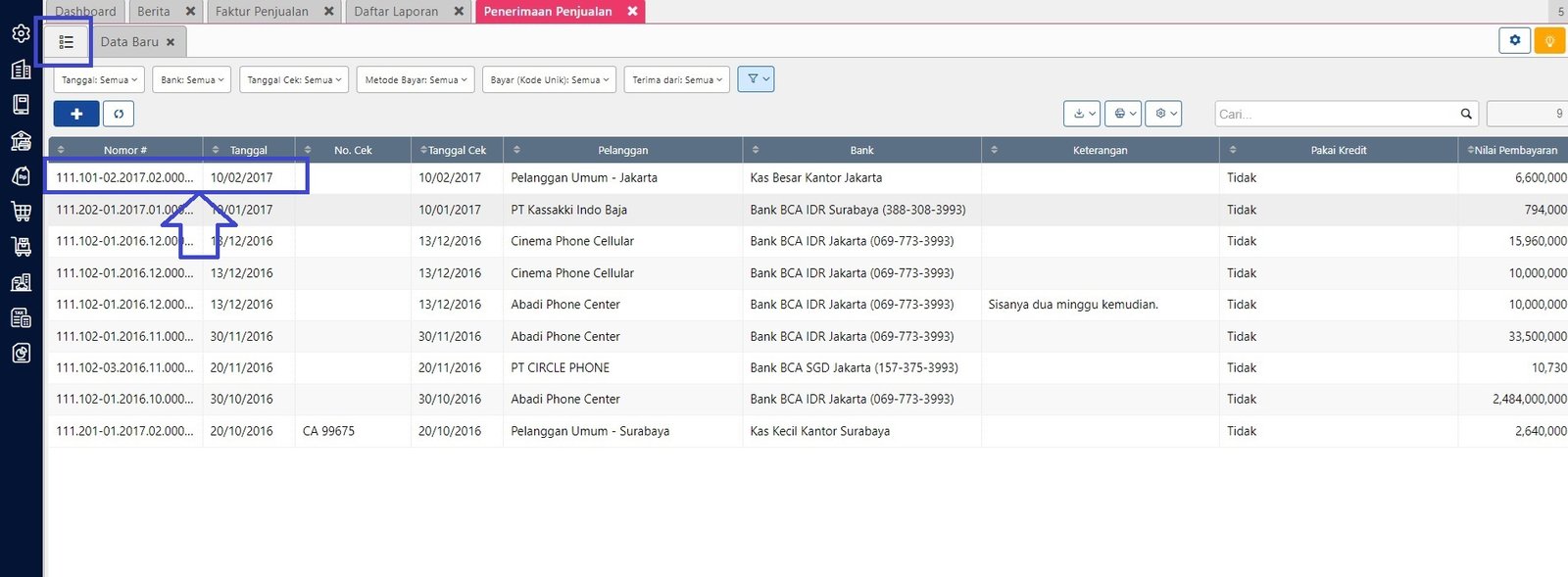 - Masuk ke modul Penjualan | Penerimaan Penjualan lalu ke daftar Penerimaan Penjualan.