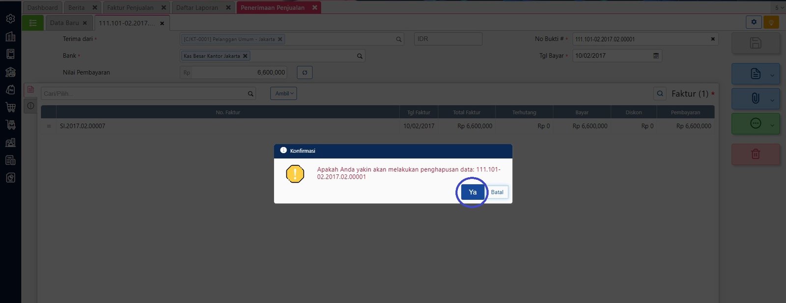 - Klik ‘Ya’ pada pesan konfirmasi untuk melanjutkan proses menghapus penerimaan penjualan.