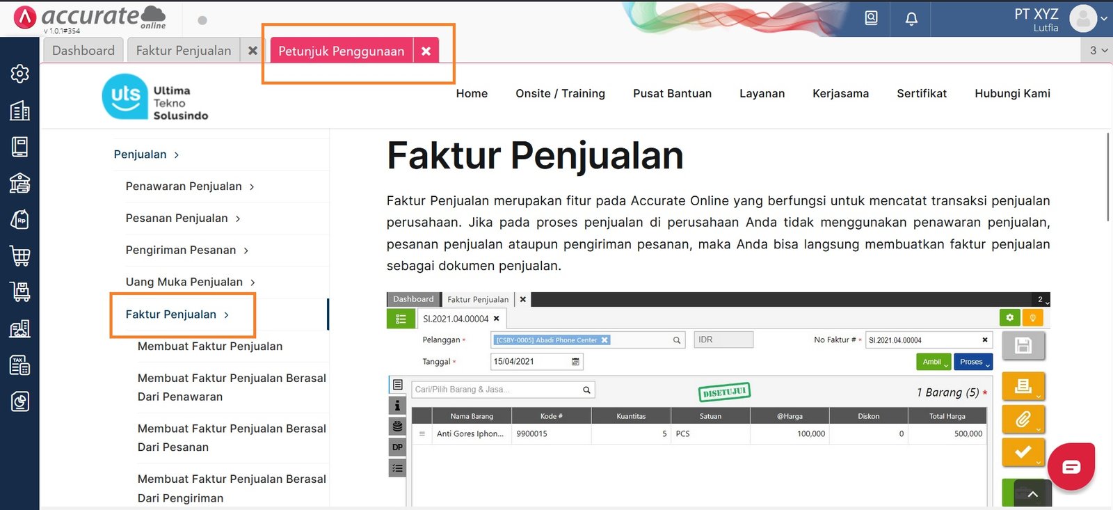 Selain itu, pada setiap halaman formulir transaksi, juga tersedia Petunjuk Penggunaan, yaitu dengan mengklik gambar lampu. Sebagai contoh pada formulir Faktur Penjualan berikut ini, petunjuk penggunaan terdapat pada pojok kanan atas formulir. Kemudian akan tampil tab baru yang berisi informasi Petunjuk Penggunaan.