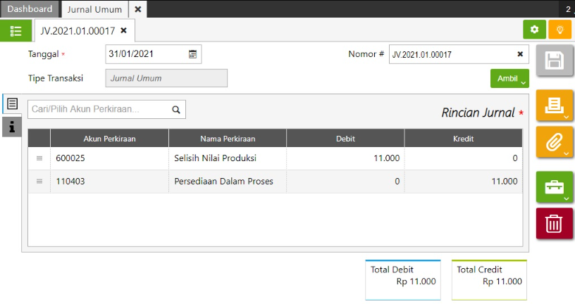 Dan jurnal atas variance tersebut, bisa anda lihat dari formulir transaksi Jurnal Umum dengan jenis Proses Akhir Bulan yaitu dari menu Buku Besar.