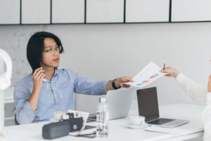 Skip to contentAsian office worker handed documents to colleague. Indoor portrait of brunette freelance programmer in earphones sitting with laptop and camera, while drinking coffee..