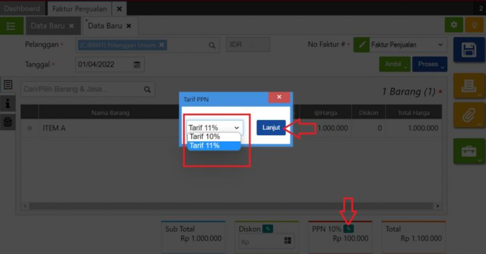 2. Ubah tarif PPN pada transaksi menjadi 10%.