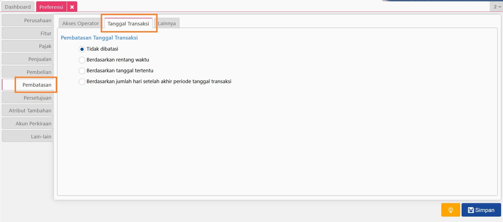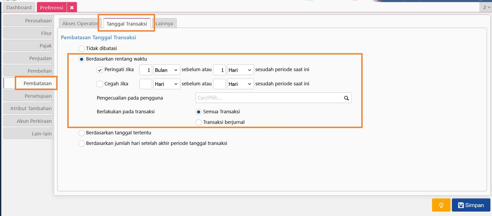 Pengaturan pembatasan untuk melakukan penginputan transaksi berdasarkan waktu/tanggal transaksi yang diinput di data usaha Accurate Online. Hal ini bertujuan untuk mencegah data Laporan Keuangan periode sebelumnya berubah atau mencegah terjadinya kecurangan oleh oknum staf. Pembatasan ini dibagi menjadi 4, yaitu ;