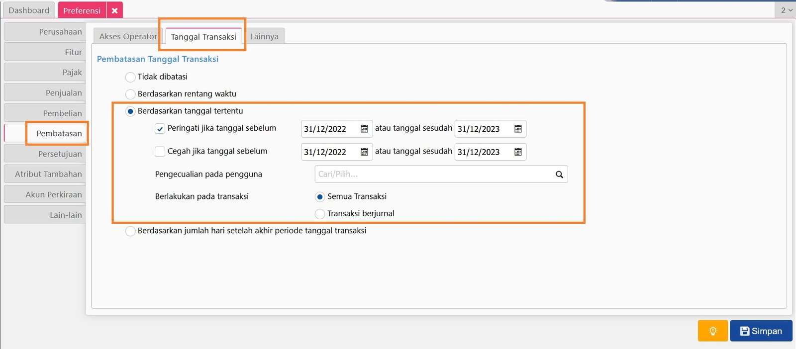 • Berdasarkan tanggal tertentu : membatasi penginputan transaksi ke data usaha Accurate Online berdasarkan tanggal transaksi yang diinput. Misalnya sebelum tanggal 31 Des 2022 atau setelah tanggal 31 Des 2023. Dengan pilihan pembatasannya adalah Peringati Jika (hanya diperingati tapi masih diinput) dan Cegah Jika (tidak bisa diinput). Serta pilihan jenis transaksi yang terdiri dari Semua Transaksi atau Transaksi Berjurnal.