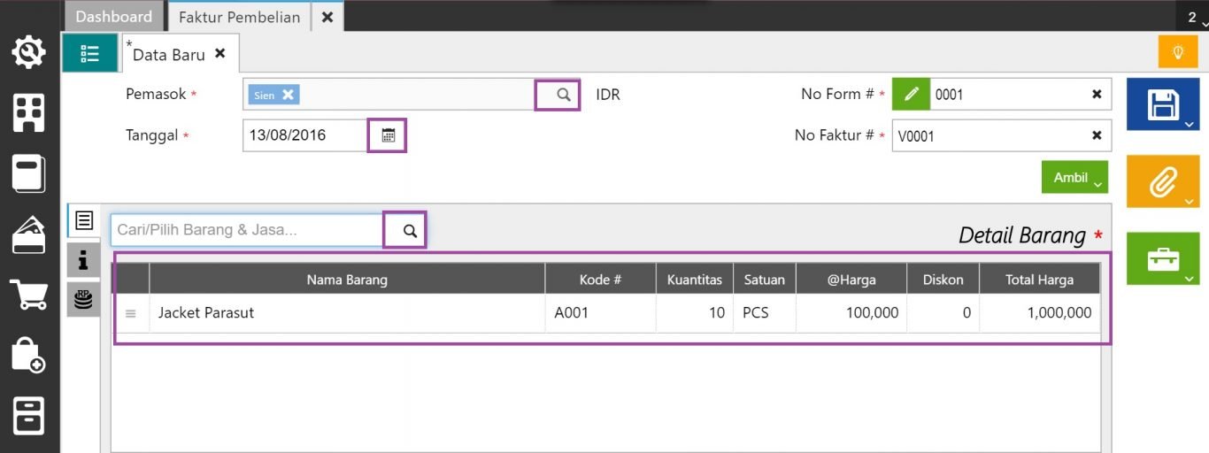 2. Pilih Pemasok Barang dan isi item-item yang dibeli di Tab Detail Barang.