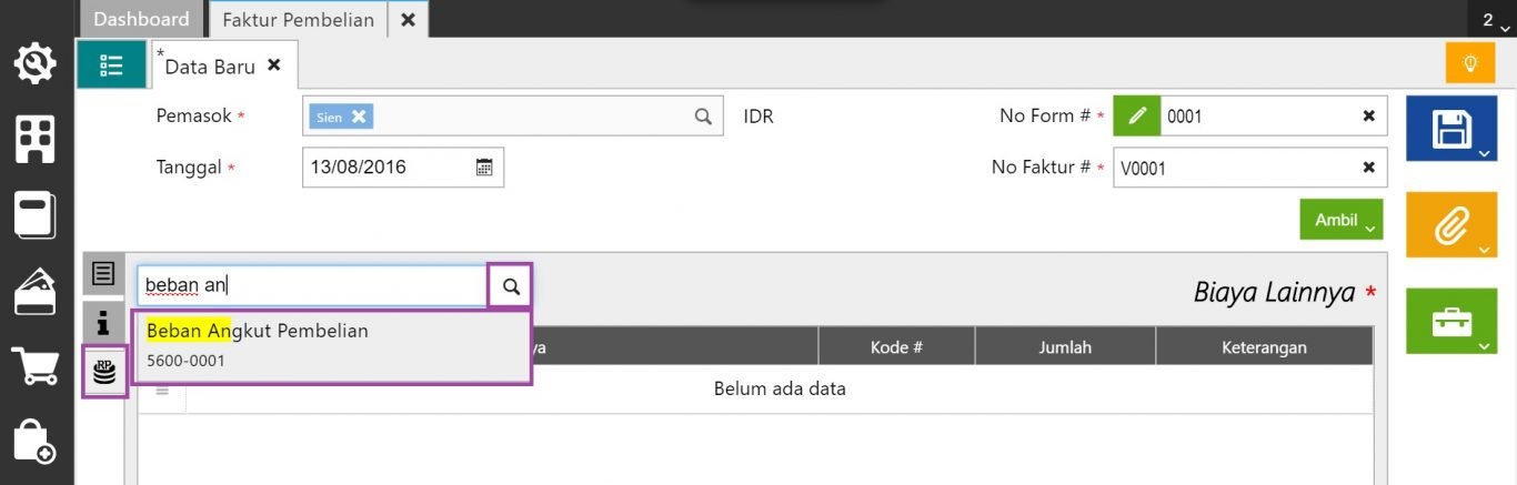 1. Masih di form Faktur Pembelian tsb, ke tab Biaya lainnya, pilih akun beban yang akan dialokasikan ke nilai barang.