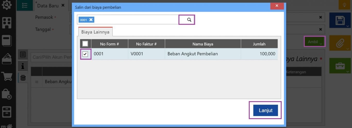 • Pada tab Beban lainnya klik Ambil lalu klik Biaya Pembelian. Pilih beban yang akan di bayarkan lalu klik Lanjut.