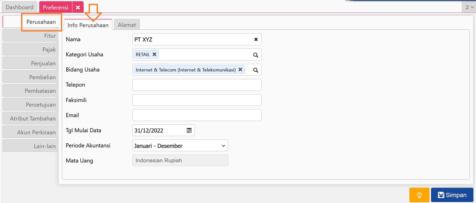 2. Klik Perusahaan dan terdapat 2 tab yaitu Info Perusahaan dan Alamat. Pada tab Info Perusahaan, berisi informasi Nama, Kategori Usaha, Bidang Usaha, Telp, Faksimili, Email serta Tanggal Mulai Data, Periode Akuntansi dan Mata Uang Data Usaha Anda.