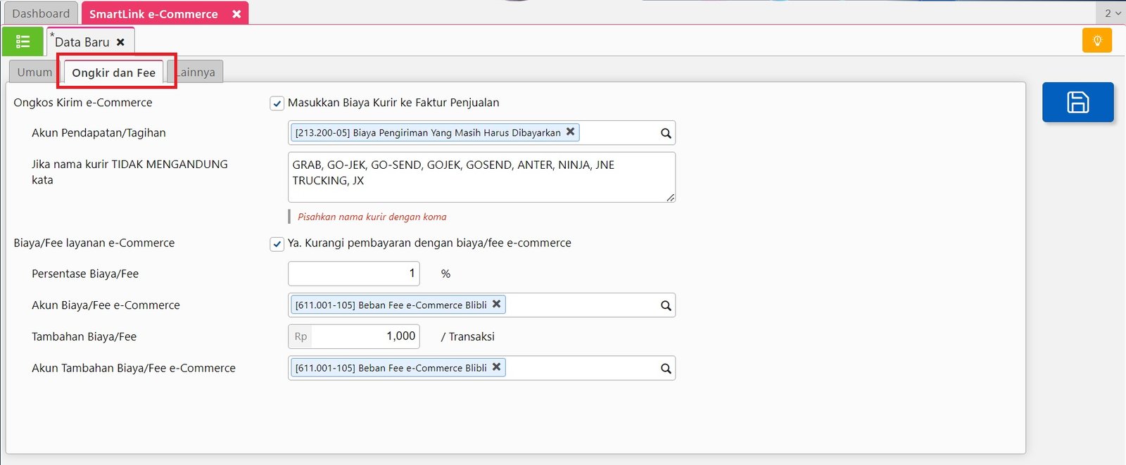 Biaya/Fee layanan e-Commerce : Terdapat 2 pilihan biaya/fee layaan e-Commerce, yaitu berdasarkan Persentase Biaya/Fee dan Tambahan Biaya/Fee per transaksi. Anda bisa mengisikan kedua pilihan tersebut atau salah satu diantaranya dan nantinya nilai pada Penerimaan Penjualan akan otomatis dikurangi dengan biaya/fee layanan e-commerce tersebut.