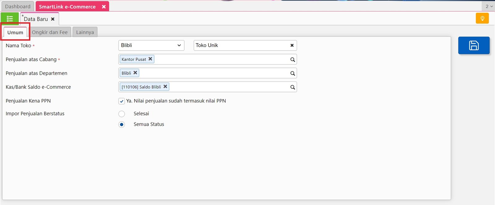 Penjualan atas Departemen : isikan nama Departemen yang sesuai, jika Anda ingin memisahkan penjualan per e-commerce. Atau kosongkan jika Anda tidak mempunyai kebutuhan akan hal tersebut.