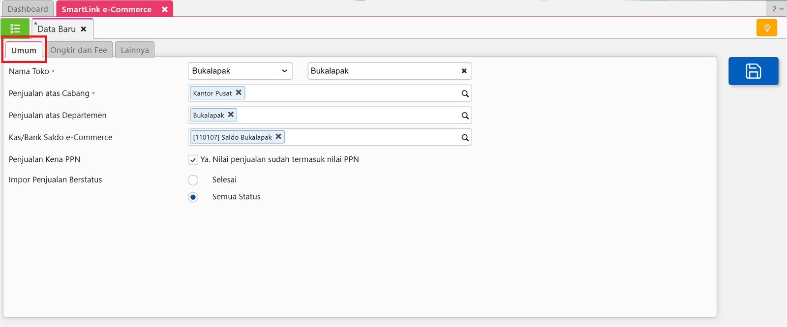 Penjualan atas Departemen : isikan nama Departemen yang sesuai, jika Anda ingin memisahkan penjualan per e-commerce. Atau kosongkan jika Anda tidak mempunyai kebutuhan akan hal tersebut.