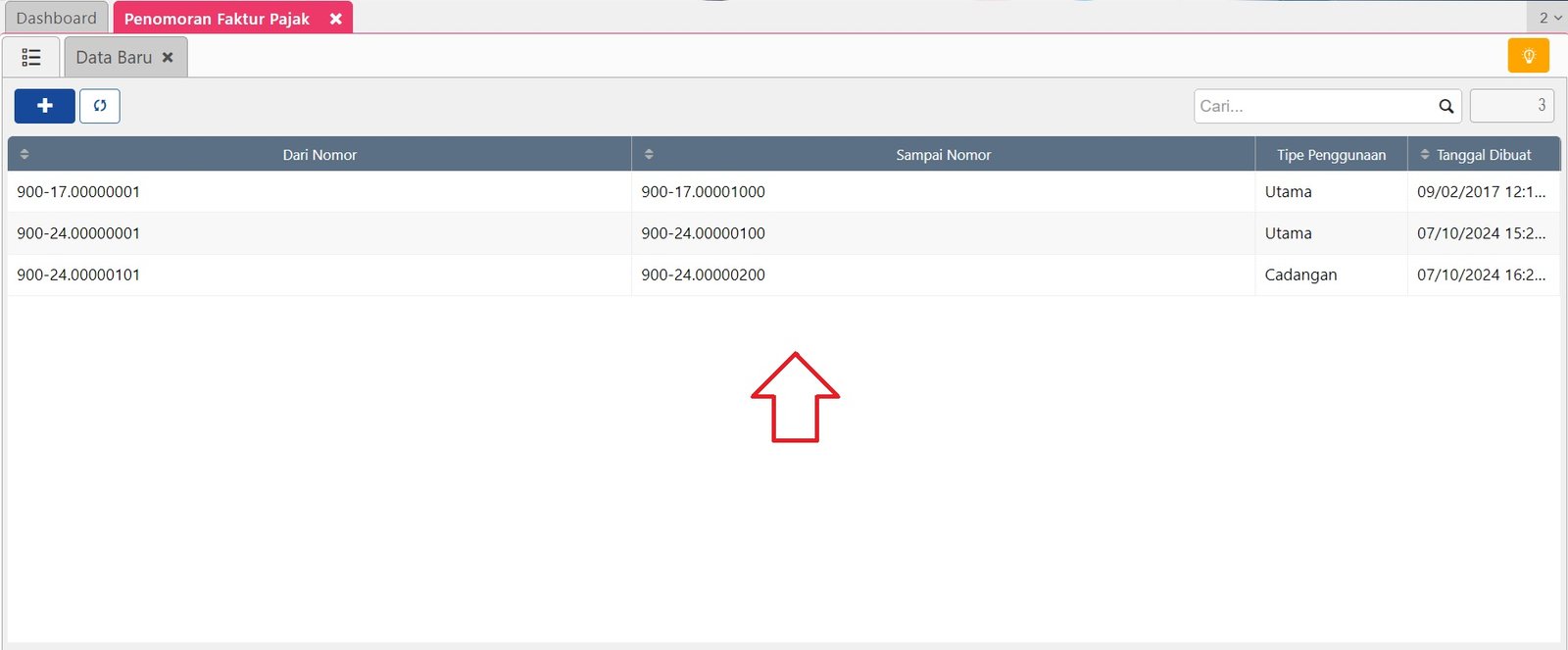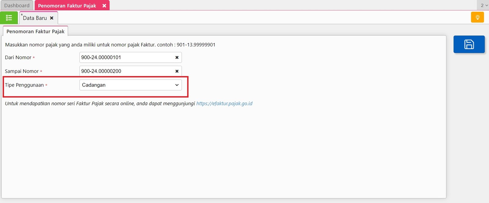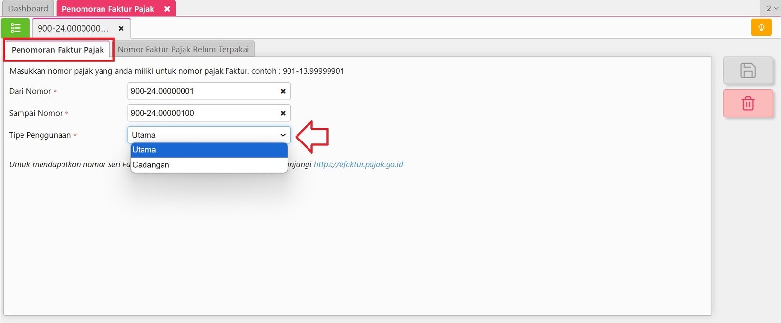 - Tambahkan Nomor Seri Faktur Pajak sesuai dengan yang didapat dari DJP dan tentukan Tipe Penggunaan Nomor Seri Faktur Pajak tersebut, yaitu Utama atau Cadangan. Utama merupakan penomoran faktur pajak yang akan digunakan dalam transaksi penjualan saat ini, sedangkan Cadangan merupakan penomoran faktur pajak yang akan digunakan sebagai cadangan dalam transaksi penjualan.