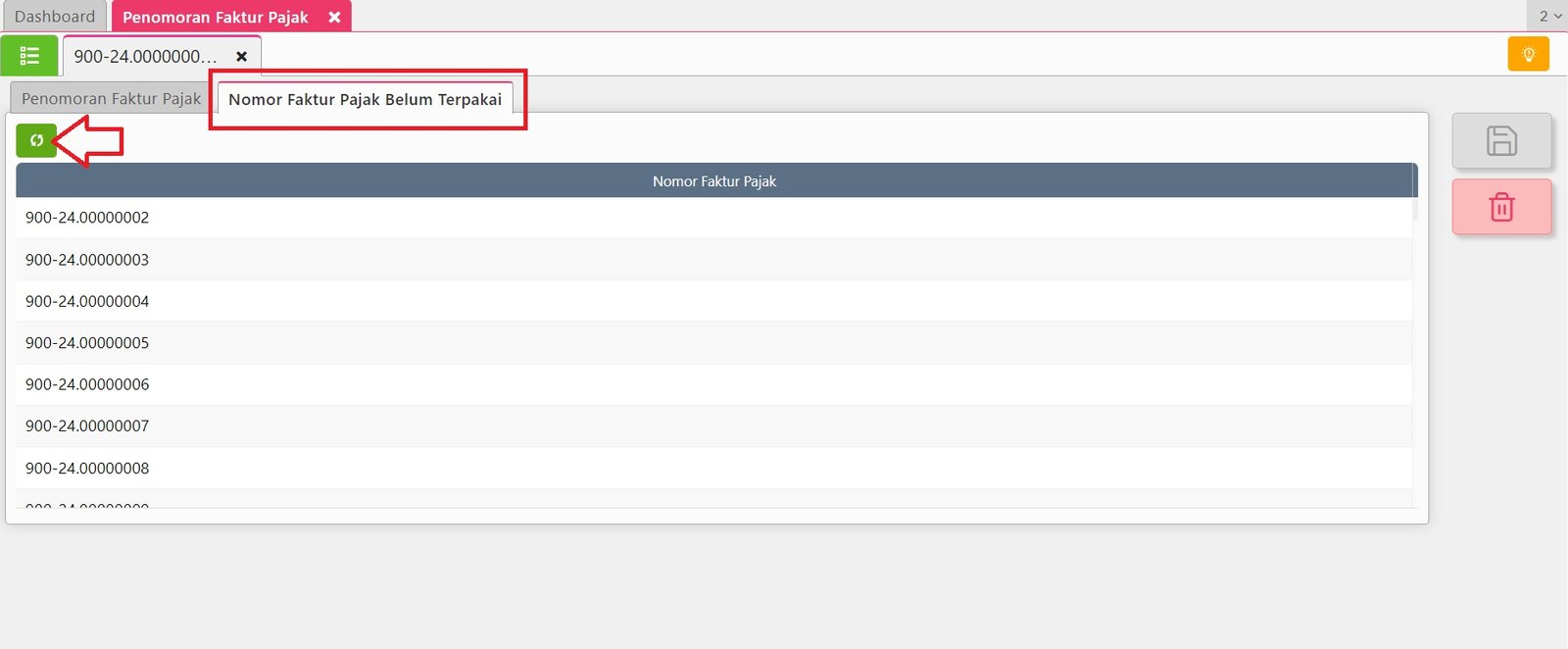 - Informasi Nomor Seri Faktur Pajak yang belum digunakan, bisa dilihat melalui Penomoran Faktur Pajak tersebut ke tab Nomor Faktur Pajak Belum Terpakai lalu klik tombol perbarui, maka akan tampil informasi Nomor Seri Faktur Pajak yang belum digunakan dalam transaksi penjualan.